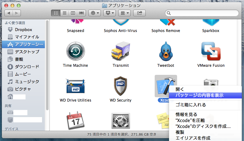 2.Finderからアプリケーションフォルダへアクセスし、Xcodeのアイコンを右クリックし、「パッケージの内容を表示」をクリックします。