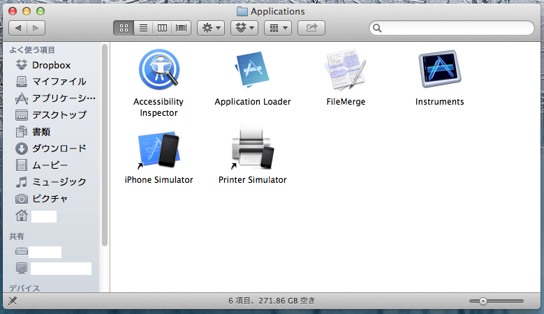 その中にある「Contents」フォルダの中にある「Applications」フォルダの中の「iPhone Simulator」を起動します。(必要に応じてDockに追加してください)