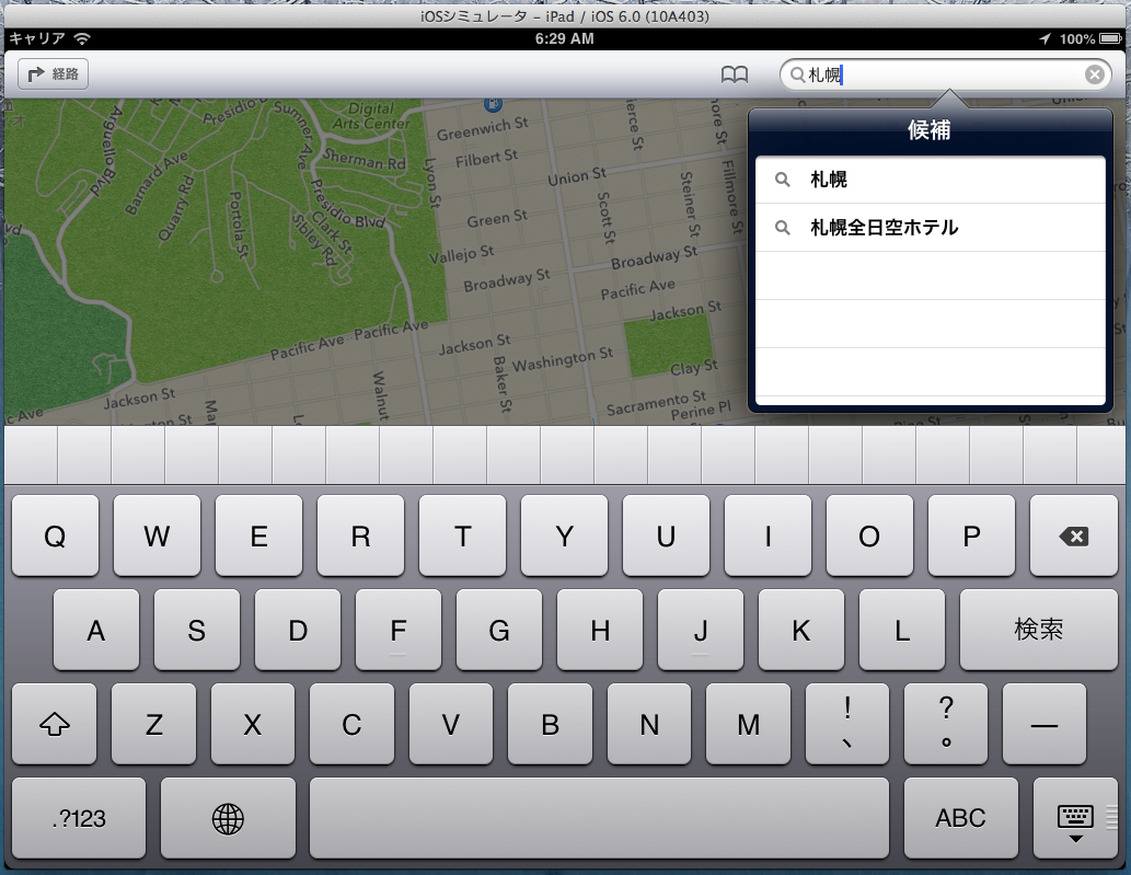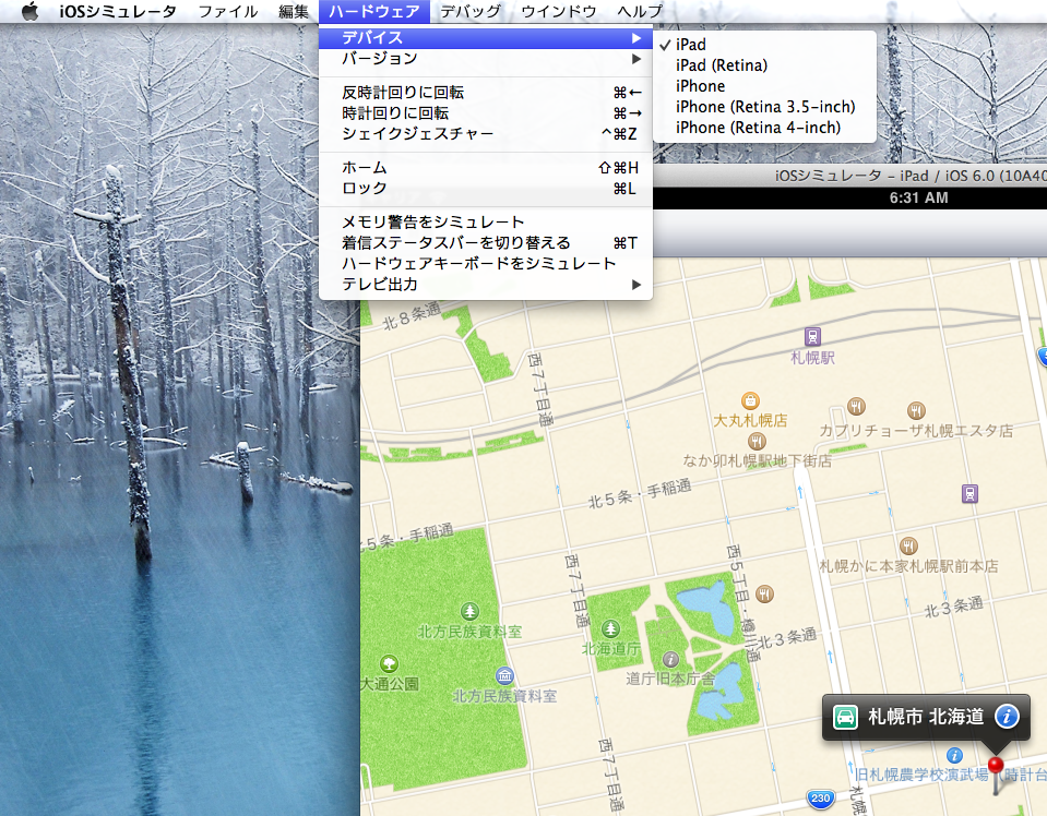 ※ちなみに今回は地図目的でシミュレーターを使いますが、Safariも入っているので僕はこれで普段、iPhone向けのホームページ作成の表示確認に使っています。いちいち実機を立ち上げる必要がなく、かなり使えるのでDockに入れておくと何かと便利です。