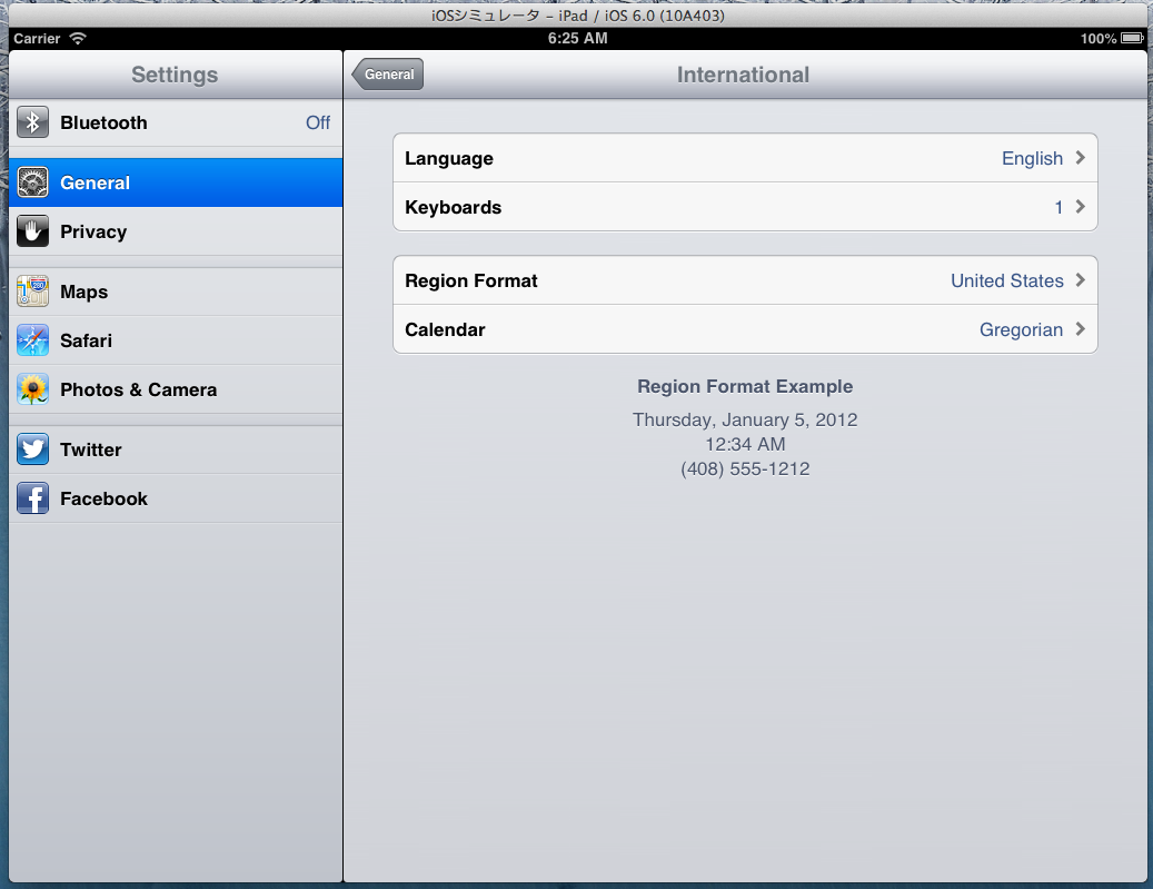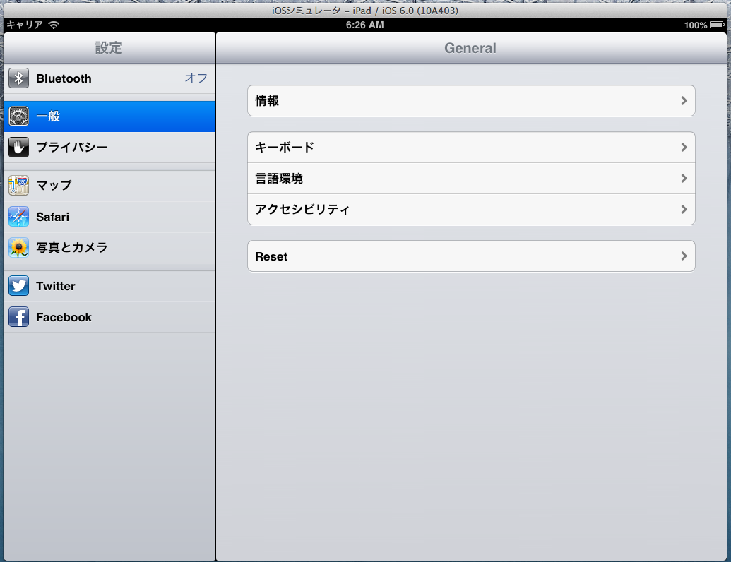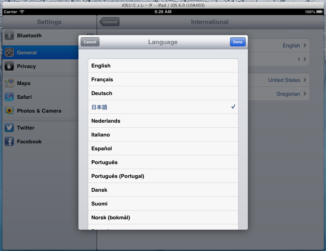 初期状態では英語版のiPhoneが立ち上がりますので、これをまず日本語対応させて、表示面積的に使いやすいiPadのシミュレーターに変更しようと思います。