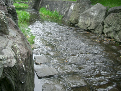 石にぶつかった拍子に,フタと電池が外れて下流に流されてしまったのだ.