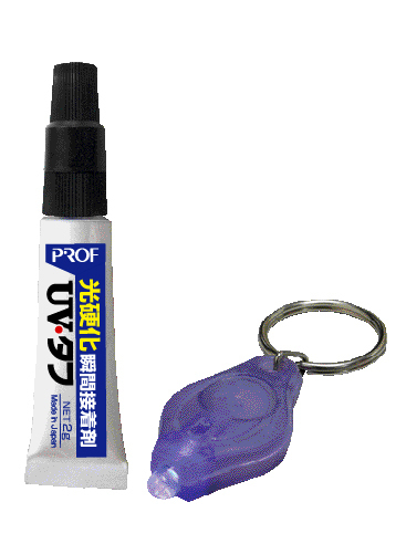 >この「UV・タフ」は今までの瞬間接着剤と違って、一旦容器から出して固まり始めるまで約60秒の余裕があり、その間に接着物同士の最適な位置決めが可能。接着位置が決まれば写真右のUV-LEDライト(紫外線LED)を照射することにより、約5秒で瞬間硬化します。